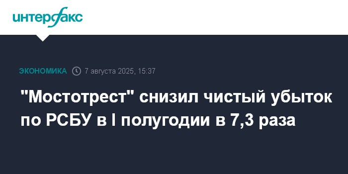 Москва. 7 августа. INTERFAX.RU - ПАО "Мостотрест" снизило чистый убыток по РСБУ в январе-июне 2025 года в 7,3 раза, до 22,2 млн руб., говорится в отчетности компании.