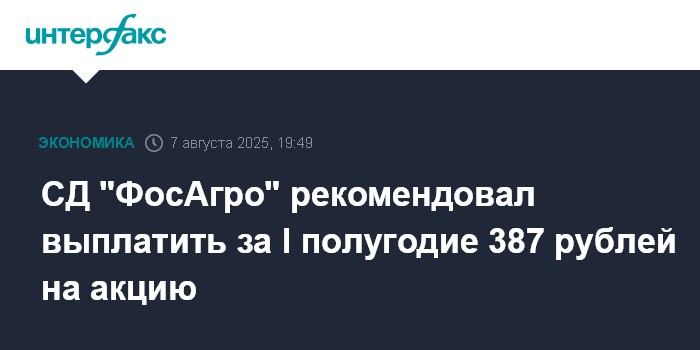 Москва. 7 августа. INTERFAX.RU - Совет директоров "ФосАгро" рекомендует акционерам утвердить выплату дивидендов по результатам 6 месяцев 2025 года в размере 387 рублей на акцию, сообщила компания.
