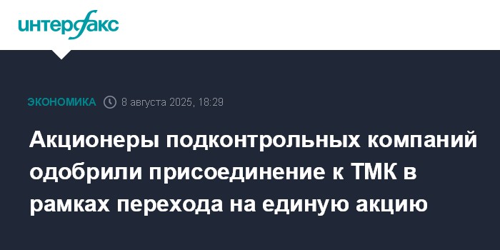 Москва. 8 августа. INTERFAX.RU - Акционеры и участники восьми ключевых подконтрольных обществ одобрили присоединение к ПАО "Трубная металлургическая компания" (ТМК) в рамках перехода на единую акцию.