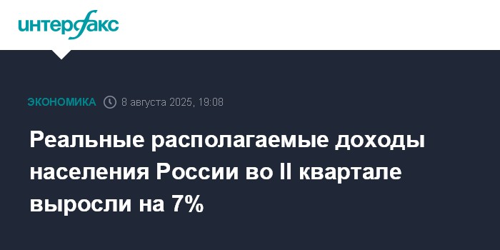 Москва. 8 августа. INTERFAX.RU - Во II квартале 2025 года рост реальных располагаемых доходов населения России составил 7% в годовом сравнении, сообщил Росстат.