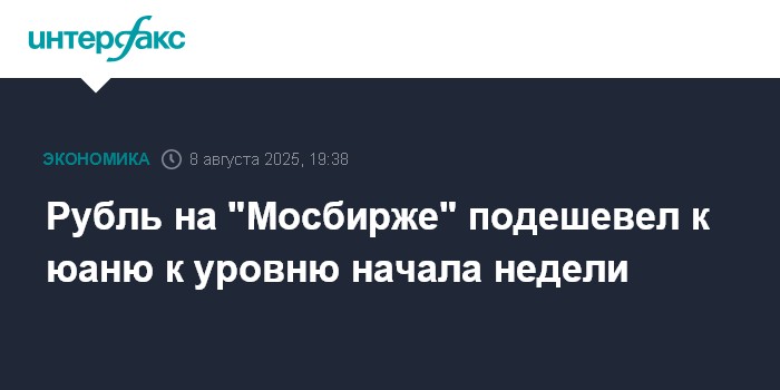 Москва. 8 августа. INTERFAX.RU - В пятницу на "Московской бирже" рубль подешевел к юаню, отыграв укрепление предыдущего дня и вернувшись в паре с юанем к уровням начала недели.