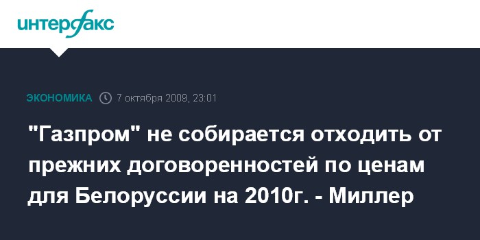 "Газпром" не собирается отходить от прежних договоренностей по ценам для Белоруссии на 2010г. - Миллер