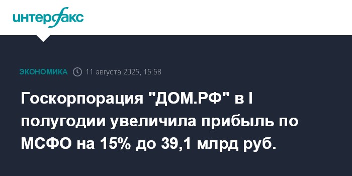 Госкорпорация "ДОМ.РФ" в I полугодии увеличила прибыль по МСФО на 15% до 39,1 млрд руб.