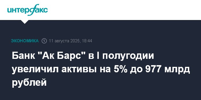 Москва. 11 августа. INTERFAX.RU - Активы банк "Ак Барс" за январь-июнь 2025 года выросли на 4,9% до 977 млрд рублей. Об этом говорится в отчетности кредитной организации по РСБУ.