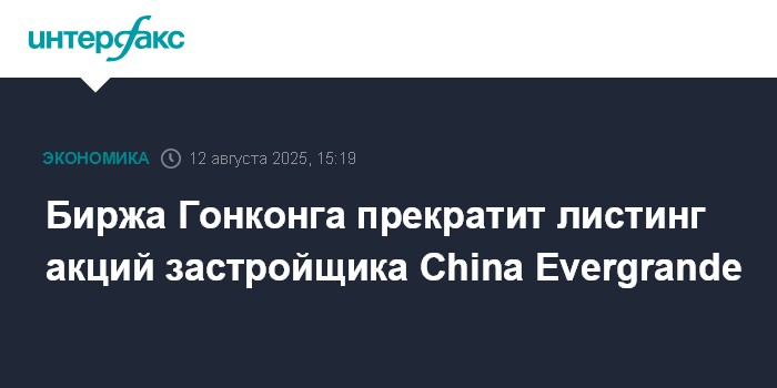 Москва. 12 августа. INTERFAX.RU - Акции проблемного китайского застройщика China Evergrande Group перестанут торговаться на Гонконгской фондовой бирже 25 августа, сообщила компания.