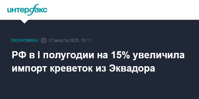 Москва. 12 августа. INTERFAX.RU - РФ в первом полугодии импортировала из Эквадора 14 тыс. тонн креветок, что на 15% больше, чем за аналогичный период прошлого года. Об этом сообщает Рыбный союз со ссылкой на данные Национальной палаты аквакультуры Эквадора.