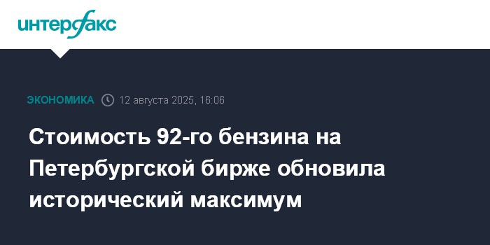 Москва. 12 августа. INTERFAX.RU - Стоимость Аи-92 на Петербургской бирже по итогам торгов во вторник обновила исторический максимум, свидетельствуют данные площадки.