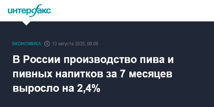Москва. 13 августа. INTERFAX.RU - Российские пивовары в январе-июле 2025 года произвели 543,3 млн декалитров (дал) пива и пивных напитков, что на 2,4% больше, чем за аналогичный период 2024 года, сообщает Росалкогольтабакконтроль.