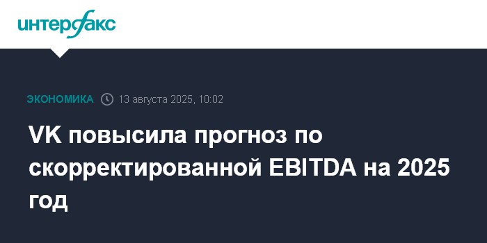 Москва. 13 августа. INTERFAX.RU - Интернет-холдинг VK повысил прогноз на 2025 год по скорректированной EBITDA и теперь ожидает, что показатель превысит 20 млрд рублей, сообщила компания.