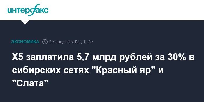 X5 заплатила 5,7 млрд рублей за 30% в сибирских сетях "Красный яр" и "Слата"