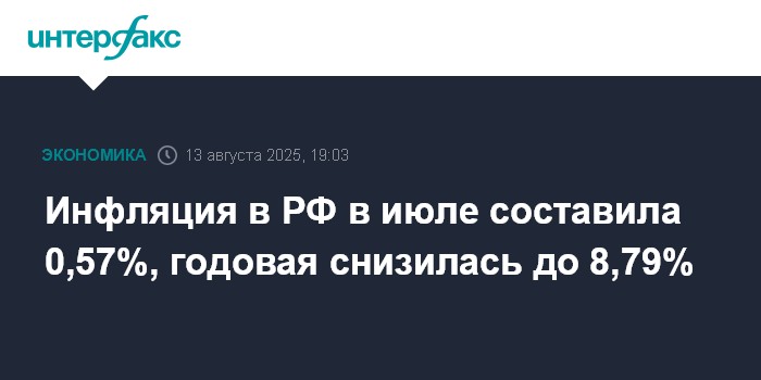 Годовая инфляция, по данным Росстата, в июле 2025 года замедлилась до 8,79% (аналитики ожидали 8,99%) с 9,40% на конец июня, 9,88% на конец мая, 10,23% на конец апреля, 10,34% на конец марта после 10,06% на конец февраля, 9,92% на конец января и 9,52% на конец декабря 2024-го.