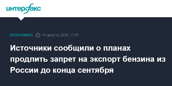 Москва. 14 августа. INTERFAX.RU - Власти намерены продлить запрет на экспорт бензина, действующий сейчас до конца августа, еще и на сентябрь, сообщили "Интерфаксу" источники, знакомые с итогами прошедшего у вице-премьера Александра Новака совещания по ситуации на топливном рынке.