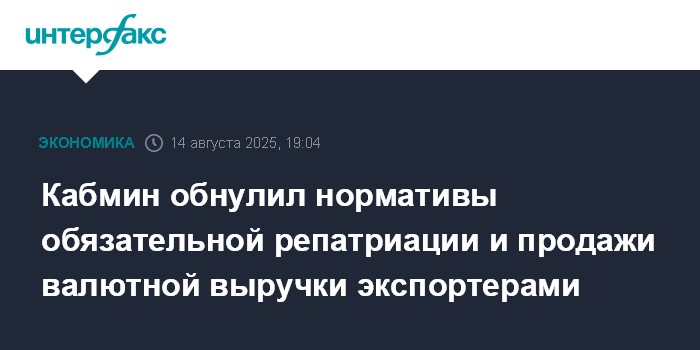 Москва. 14 августа. INTERFAX.RU - Нормативы обязательной репатриации и продажи валютной выручки для российских экспортеров снижены до нуля. Соответствующее постановление подписал премьер-министр РФ Михаил Мишустин, сообщила пресс-служба правительства.