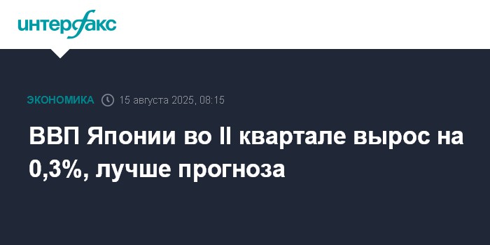 Москва. 15 августа. INTERFAX.RU - Экономика Японии во втором квартале 2025 года увеличилась на 0,3% относительно предыдущих трех месяцев, по предварительным данным правительства.