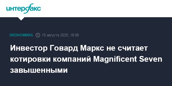 Москва. 15 августа. INTERFAX.RU - Акции компаний американской "великолепной семерки" (Magnificent Seven) не выглядят переоцененными, считает сопредседатль совета директоров инвесткомпании Oaktree Capital Management, известный инвестор Говард Маркс. Он написал об этом в заметке на сайте Oaktree.