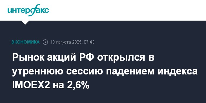 Москва. 18 августа. INTERFAX.RU - Рынок акций РФ на старте торгов утренней сессии на Мосбирже в понедельник демонстрирует негативную динамику, отыгрывая итоги встречи президентов России и США Владимира Путина и Дональда Трампа 15 августа на Аляске.