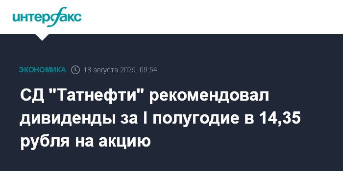 Москва. 18 августа. INTERFAX.RU - Совет директоров "Татнефти" на заочном заседании 15 августа рекомендовал акционерам утвердить дивиденды за первое полугодие 2025 года в размере 14,35 рубля на акцию, сообщила компания.