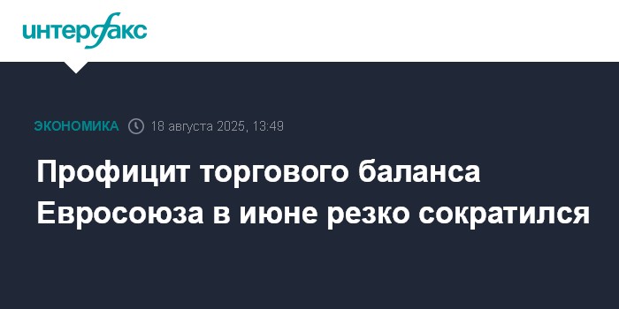 Москва. 18 августа. INTERFAX.RU - Профицит баланса внешней торговли Евросоюза в июне упал до 8 млрд евро по сравнению с 13 млрд евро в мае и 20,3 млрд евро годом ранее на фоне сокращения экспорта в США и Китай, сообщает Eurostat.