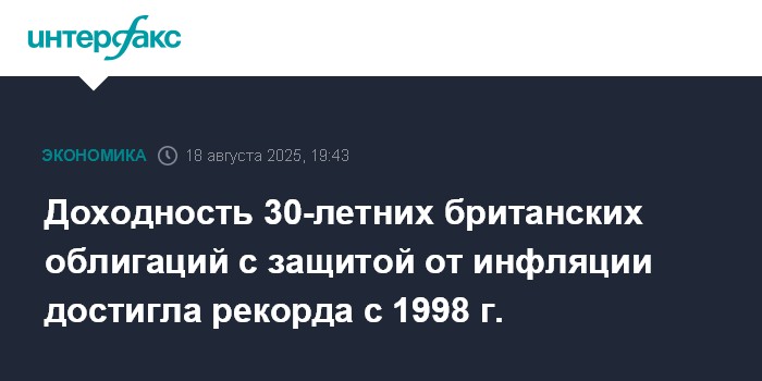 Москва. 18 августа. INTERFAX.RU - Доходность 30-летних государственных облигаций Великобритании с защитой от инфляции обновила максимум с 1998 года, достигнув 2,56%.