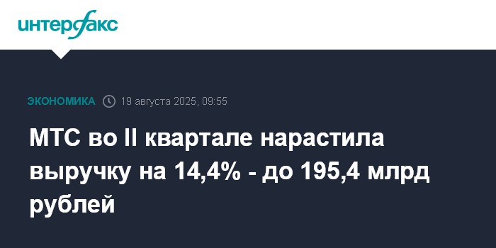 Москва. 19 августа. INTERFAX.RU - Группа "МТС" по итогам II квартала 2025 года получила выручку в 195,4 млрд рублей, что на 14,4% выше показателя аналогичного периода 2024 года, сообщила компания.