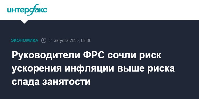 Москва. 21 августа. INTERFAX.RU - Большинство руководителей Федеральной резервной системы (ФРС) сошлись во мнении, что риск ускорения инфляции в США перевешивает риск ослабления рынка труда, говорится в протоколе июльского заседания Федерального комитета по операциям на открытом рынке (FOMC).