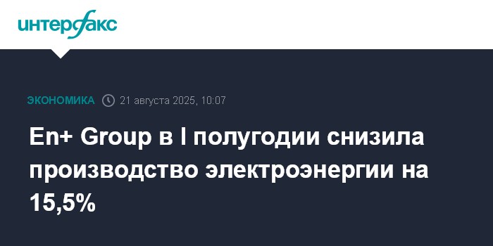 Москва. 21 августа. INTERFAX.RU - En+ Group в I полугодии 2025 года снизила производство электроэнергии на 15,5% в годовом измерении, до 39,1 млрд кВт.ч, сообщила компания.
