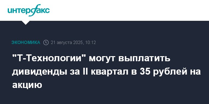 Москва. 21 августа. INTERFAX.RU - Совет директоров МКПАО "Т-Технологии" (материнская компания Т-Банка и "Т-Страхования") рекомендовал выплатить дивиденды за II квартал 2025 года в размере 35 рублей на акцию, сообщила группа.