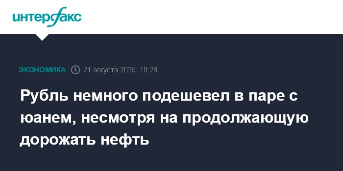 Москва. 21 августа. INTERFAX.RU - Китайский юань немного подорожал на Московской бирже днем в четверг; рубль слегка опустился, несмотря на растущую нефть.