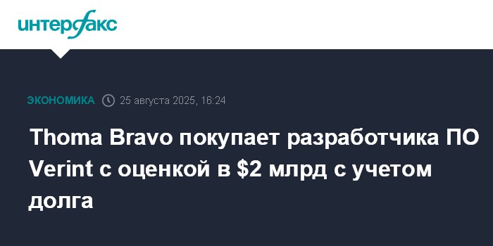 Москва. 25 августа. INTERFAX.RU - Инвестиционная компания Thoma Bravo купит Verint Systems, разработчика программного обеспечения для call-центров, примерно за $1,23 млрд.