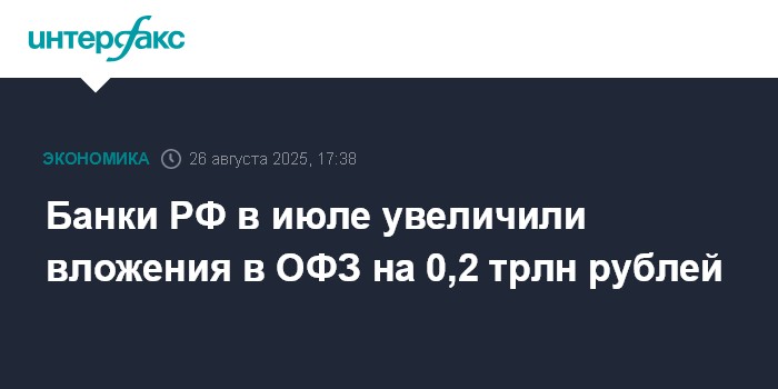 Москва. 26 августа. INTERFAX.RU - Вложения банков в ОФЗ в июле 2025 года увеличились на 0,2 трлн рублей, сообщается в обзоре ЦБ РФ о динамике развития банковского сектора, опубликованном на сайте ЦБ РФ.