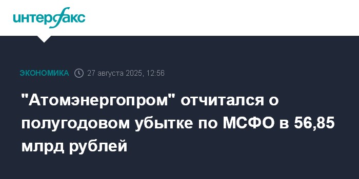 Москва. 27 августа. INTERFAX.RU - Чистый убыток АО "Атомэнергопром" по МСФО в I полугодии 2025 года составил 56,85 млрд рублей против прибыли 109,72 млрд рублей годом ранее, говорится в отчете компании.