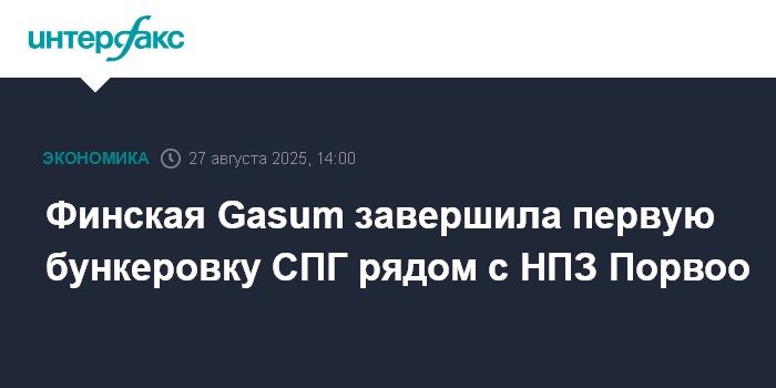 Москва. 27 августа. INTERFAX.RU - Финская государственная энергетическая Gasum провела первую операцию по бункеровке СПГ в порту Тольккинен, расположенном рядом с нефтеперабатывающим заводом Порвоо в Финляндии, сообщила компания в соцсети Linkedin.