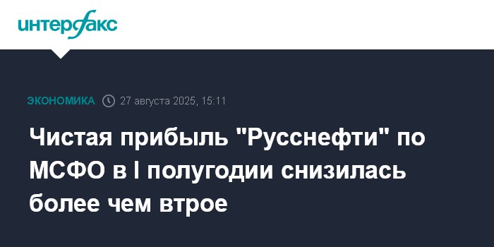 Москва. 27 августа. INTERFAX.RU - "Русснефть" в первом полугодии 2025 года получила чистую прибыль по МСФО в размере 11,81 млрд рублей против 38,48 млрд рублей за аналогичный период прошлого года, сообщается в отчетности компании. Таким образом, данный показатель снизился чуть более чем в 3,2 раза.