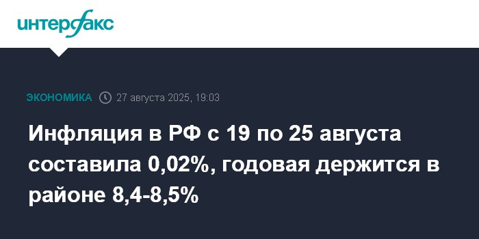 Инфляция в РФ с 19 по 25 августа составила 0,02%, годовая держится в районе 8,4-8,5%