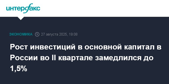 Москва. 27 августа. INTERFAX.RU - Инвестиции в основной капитал в России во II квартале 2025 года выросли на 1,5% по сравнению со II кварталом 2024 года, сообщил Росстат.