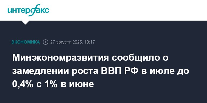 Москва. 27 августа. INTERFAX.RU - Рост ВВП РФ в июле 2025 года, по оценке Минэкономразвития, составил 0,4% в годовом сравнении после повышения на 1,0% в июне (оценка уточнена с 1,1%), 0,7% в мае (оценка уточнена с 0,8%), 1,5% в апреле (уточнена с 1,4%), на 1,1% в марте, 0,5% в феврале и 2,7% в январе, говорится в опубликованном в среду обзоре министерства "О текущей ситуации в экономике".