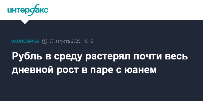 Москва. 27 августа. INTERFAX.RU - Китайский юань практически отыграл дневные потери и лишь слегка понизился на Московской бирже по итогам торгов в среду. Рубль растерял значительную часть роста, наблюдавшегося в ходе сессии. Ранее в ходе торгов он довольно заметно укреплялся в рамках подготовки компаний-экспортеров к перечислению налогов в бюджет. Единый день налоговых выплат в этом месяце приходится на четверг, 28 августа.