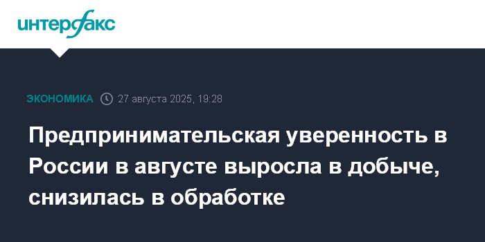 Москва. 27 августа. INTERFAX.RU - Индекс предпринимательской уверенности в России в добывающих отраслях в августе 2025 года вырос на 0,2 процентных пункта (п.п.) - до минус 1,9%, сообщил Росстат.