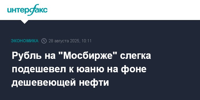 Москва. 28 августа. INTERFAX.RU - Утром в четверг на "Московской бирже" рубль немного дешевеет к юаню на фоне снижающихся котировок нефти. Поддержку рублю оказывает остаточный спрос на рублевую ликвидность со стороны экспортеров для перечисления налогов в бюджет. Единый день налоговых выплат в этом месяце приходится на четверг, 28 августа.