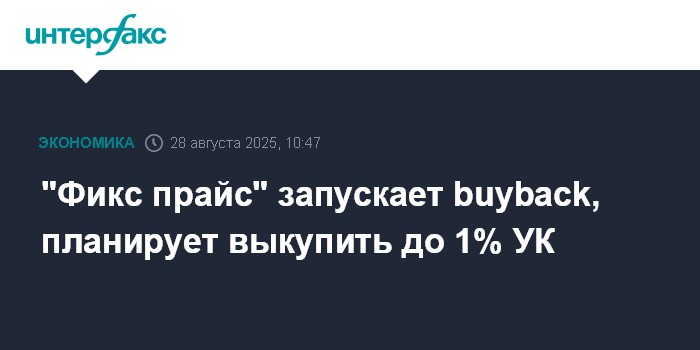 Москва. 28 августа. INTERFAX.RU - ПАО "Фикс прайс" с 1 сентября запускает программу buyback сроком до 6 месяцев, сообщила компания.