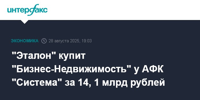 Москва. 28 августа. INTERFAX.RU - Девелоперская группа "Эталон" (юрлицо - МКПАО "Эталон Груп") заключила сделку по приобретению у АФК "Система" 100% акций АО "Бизнес-Недвижимость", сообщает пресс-служба "Эталона".