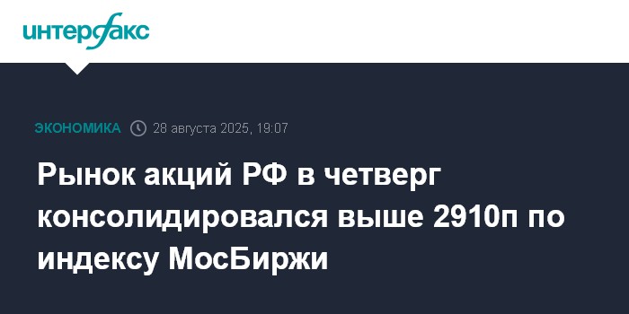 Москва. 28 августа. INTERFAX.RU -Рынок акций РФ в четверг консолидировался при смешанной динамике blue chips в ожидании геополитических новостей относительно процесса урегулирования украинского конфликта; фактором поддержки выступили позитивные данные Росстата по инфляции в РФ, в то время как давление оказала подешевевшая нефть (фьючерс на Brent просел к $67,5 за баррель). Индекс МосБиржи закрепился выше 2910 пунктов, лидировали в росте акции "РусГидро" (+4,2%) на отчете компании по МСФО.