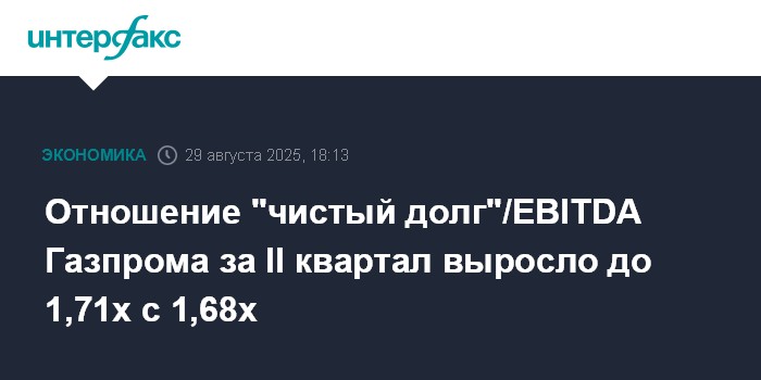 Москва. 29 августа. INTERFAX.RU - Отношение "чистый долг"/EBITDA "Газпрома" на конец июня 2025 года составило 1,71х после 1,68х на конец марта, сообщила компания.
