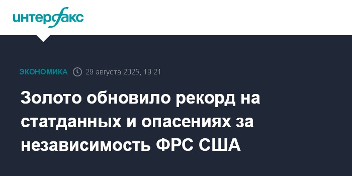 Москва. 29 августа. INTERFAX.RU - Цены на золото активно растут в пятницу и обновили исторический максимум, трейдеры оценивают статданные по инфляции и ситуацию вокруг руководства Федеральной резервной системы США.