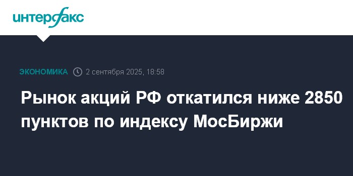 Москва. 2 сентября. INTERFAX.RU - Рынок акций РФ во вторник снизился из-за сохраняющейся геополитической неопределенности относительно сроков мирного урегулирования конфликта на Украине и рисков введения новых антироссийских санкций со стороны Запада, а также на фоне комментариев ЦБ РФ относительно сохранения инфляционного давления, что может отсрочить дальнейшее смягчение ДКП регулятора. Индекс МосБиржи откатился ниже 2850 пунктов, обновив минимум с 6 августа.
