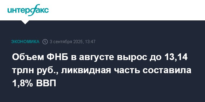 Объем ФНБ в августе вырос до 13,14 трлн руб., ликвидная часть составила 1,8% ВВП