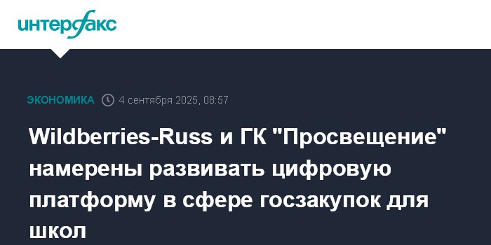 Москва. 4 сентября. INTERFAX.RU - Wildberries-Russ (ООО "РВБ") совместно с ГК "Просвещение" планируют развивать цифровую платформу в сфере госзакупок для российских школ. Об этом было объявлено в рамках сессии ВЭФ-2025 "Современное образование: новая инфраструктура, единый стандарт и передовые решения для оснащения" в четверг.
