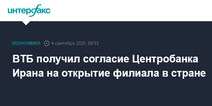 Москва. 4 сентября. INTERFAX.RU - ВТБ получил принципиальное согласие Центрального банка Ирана на открытие филиала в Иране, будет предлагать клиентам трансграничные расчеты в национальных валютах в рамках обслуживания ВЭД, рассказала "Интерфаксу" член правления ВТБ Ольга Баша в кулуарах ВЭФ.