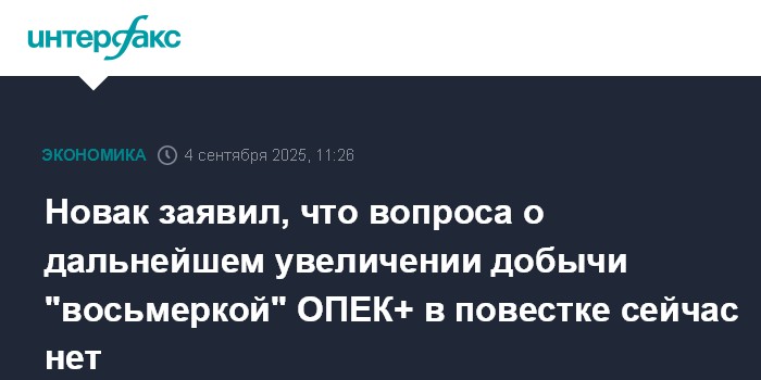 Москва. 4 сентября. INTERFAX.RU - Вопроса о дальнейшем увеличении добычи нефти восемью странами-добровольцами ОПЕК+ в повестке сейчас нет, решение принимается в ходе заседания, заявил журналистам вице-премьер РФ Александр Новак, отвечая на вопрос, будет ли восьмерка рассматривать в предстоящее воскресенье вопрос о дальнейшем увеличении добычи.