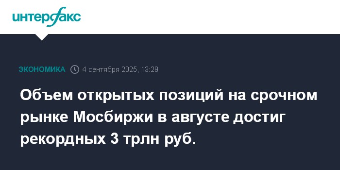 Москва. 4 сентября. INTERFAX.RU - Объем открытых позиций на срочном рынке "Московской биржи" в августе 2025 обновил исторический максимум, составив 3 трлн рублей на конец месяца, говорится в сообщении торговой площадки.